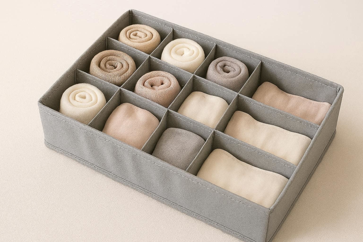 Crafted from soft breathable cotton fabric, these multi compartment organizer bags are designed for storing socks, underwear, bras, and other small clothing items. Each bag features 24 small compartments for socks and 8 larger compartments for underwear or bras, keeping your items neatly separated and easy to find. The bags measure 35 x 30 cm, with a sturdy zipper closure and a handle for easy carrying or hanging.