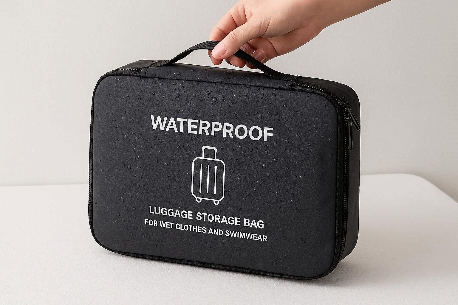 The bag has a large main compartment that can hold multiple wet items, and a small outer pocket for toiletries or accessories. It is lightweight and compact, fitting perfectly in carry on suitcases, backpacks, or beach bags. The reinforced handles make it easy to carry, and the foldable design lets you store it flat when not in use. It is perfect for beach trips, pool days, or gym sessions, helping you keep your luggage clean and organized.